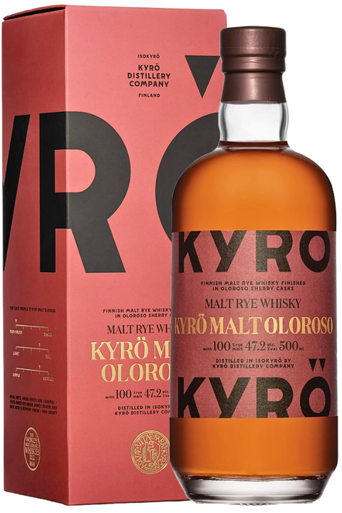 Kyrö Malt Oloroso is the first Finnish single batch rye whisky, made from 100% malted Finnish wholegrain rye. It is double pot-distilled and aged in three barrel types: Oloroso sherry, new American oak & ex-bourbon. Mellow yet spicy, nose of nuts and caramel.